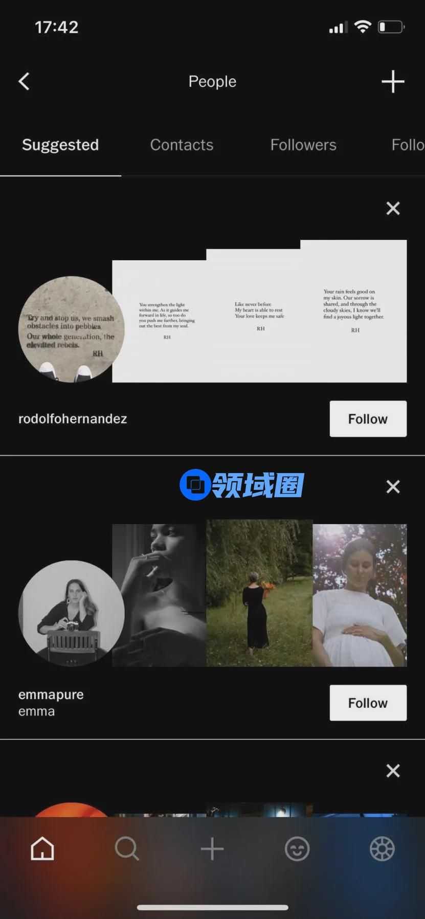 1.「VSCO」上活跃着众多摄影爱好者,他们会上传作品,用户不仅可以关注他们,还可以与他们交换 Messenger、WhatsApp 等联系方式,进一步交流摄影心得。