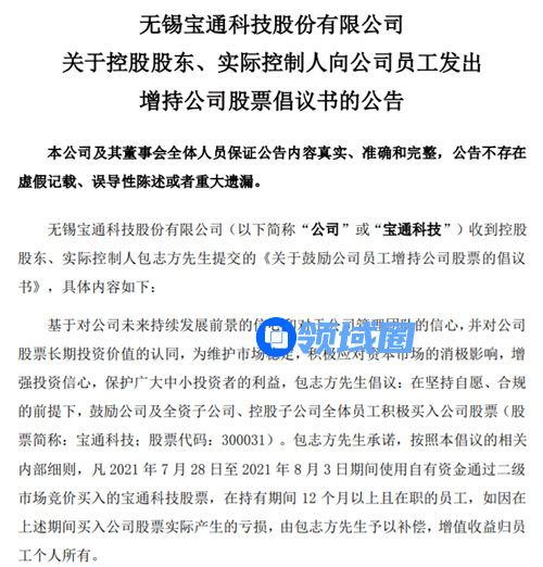 公告显示,宝通科技及其子公司员工在2021年7月28日至2021年8月3日之间,通过二级市场以自有资金买入宝通科技股票,若持有12个月还是亏损的话(员工需在职),由董事长包志方进行补偿;若产生盈利,则盈余归员工个人所有。