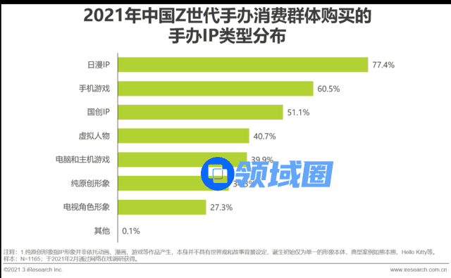 据艾瑞咨询《Z世代手办消费趋势报告》显示,2021年国内Z世代购买手游IP型手办的占比已经跻身第二,仅次于日漫。若算上电脑和主机游戏的占比,游戏IP实际上已经超越了日漫IP,成为手办周边、潮玩产业中的大头。