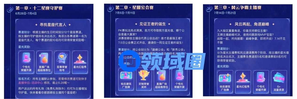 不得不说,快手这一次“火药味”十足的年度游戏活动,真是将粉丝们的肾上腺素彻底拉满!快手的星光大赏活动,值得期待!更令人兴奋的是,快手的这次活动周期长,活动内容丰富,一次就能网友们过足瘾:从6月28日到7月21日,包含12星座守护赛、星耀公会赛以及风云争霸主播赛三大重大阶段活动,将相继与大家见面!