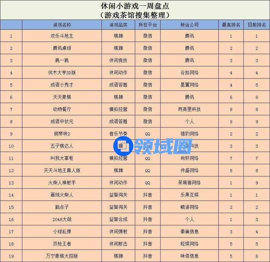 本周休闲游戏方面,微信小游戏榜单排名变化不大,榜单头部仍有几款经典小游戏囊括,其中榜单前三均由腾讯旗下产品囊括,它们分别是棋牌游戏《欢乐斗地主》《腾讯桌球》和休闲竞技类游戏《跳一跳》。