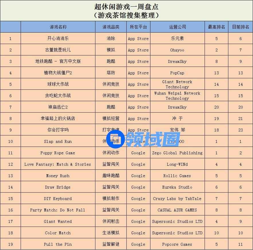 超休闲方面,在App Store免费游戏榜单中,经典消除游戏《开心消消乐》依然稳坐榜首,Ohayoo上周登榜的新游《古董就是玩儿》本周排名略微下滑,当前位于App Store超休闲游戏榜单第2名,同时DreamSky旗下经典跑酷游戏《地铁跑酷 - 官方中文版》也跻身进入了榜单前三,当前位于App Store免费游戏榜单第9名。