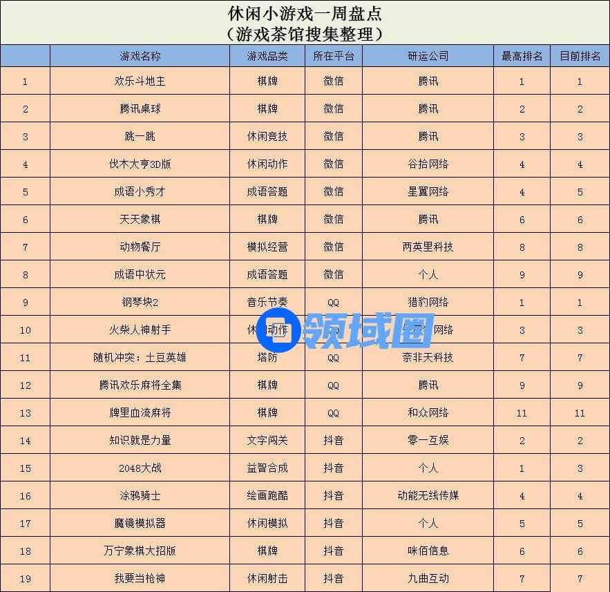 本周休闲游戏方面,微信小游戏榜单中,仍由经典小游戏占据榜单头部大多数席位,当前,腾讯《欢乐斗地主》持续稳坐榜首,同样来自腾讯的《腾讯桌球》和《跳一跳》也依然分别位于榜单第2和第3名。
