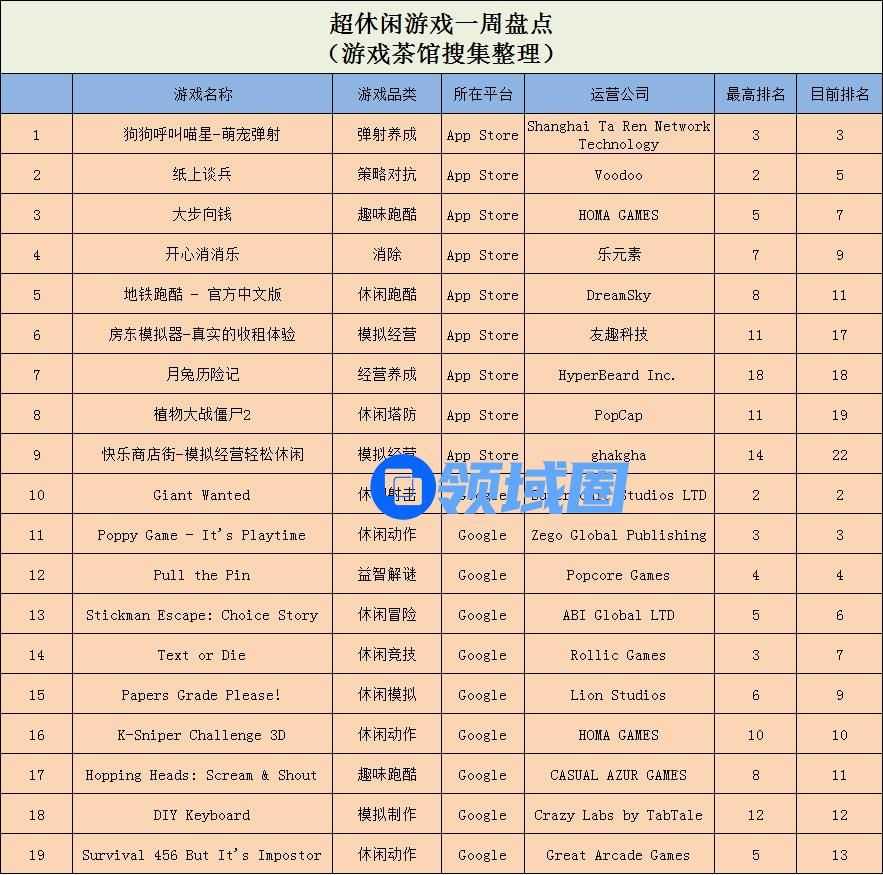 超休闲游戏方面,在App Store免费游戏榜单,弹射玩法的《狗狗呼叫喵星-萌宠弹射》登顶榜首Voodoo的《纸上谈兵》和趣味跑酷玩法的《大步向钱》分别拿下榜单第2和第3名。在Google Play免费游戏榜单中,射击玩法的《Giant Wanted》登上榜首,动作游戏《Poppy Game - It's Playtime》和益智玩法的《Pull the Pin》分别位于榜单第2和第3名。