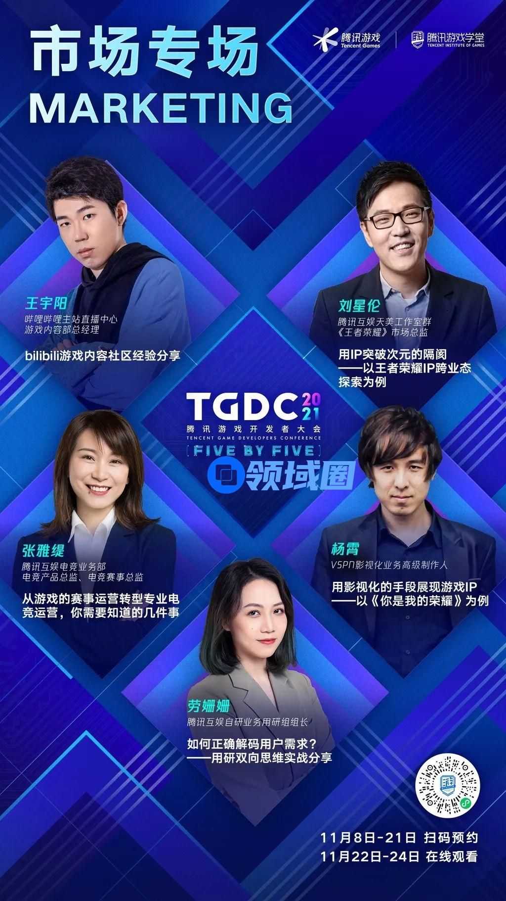 哔哩哔哩主站直播中心、游戏内容部总经理王宇阳,将基于Bilibili分享游戏内容社区的构建经验;腾讯互娱天美工作室群《王者荣耀》市场总监刘星伦,将带大家回顾《王者荣耀》IP发展逻辑与跨业态探索;腾讯互娱电竞业务部电竞产品总监、电竞赛事总监张雅缇,将以TGA等赛事为例,分享游戏赛事运营到专业电竞运营的转型;VSPN 影视化业务高级制作人杨霄,将围绕《你是我的荣耀》,展开聊聊如何通过影游联动打造跨圈层优质作品;腾讯互娱自研业务用研组组长劳姗姗则将基于用研维度,分享对于不同品类、区域用户的洞察。