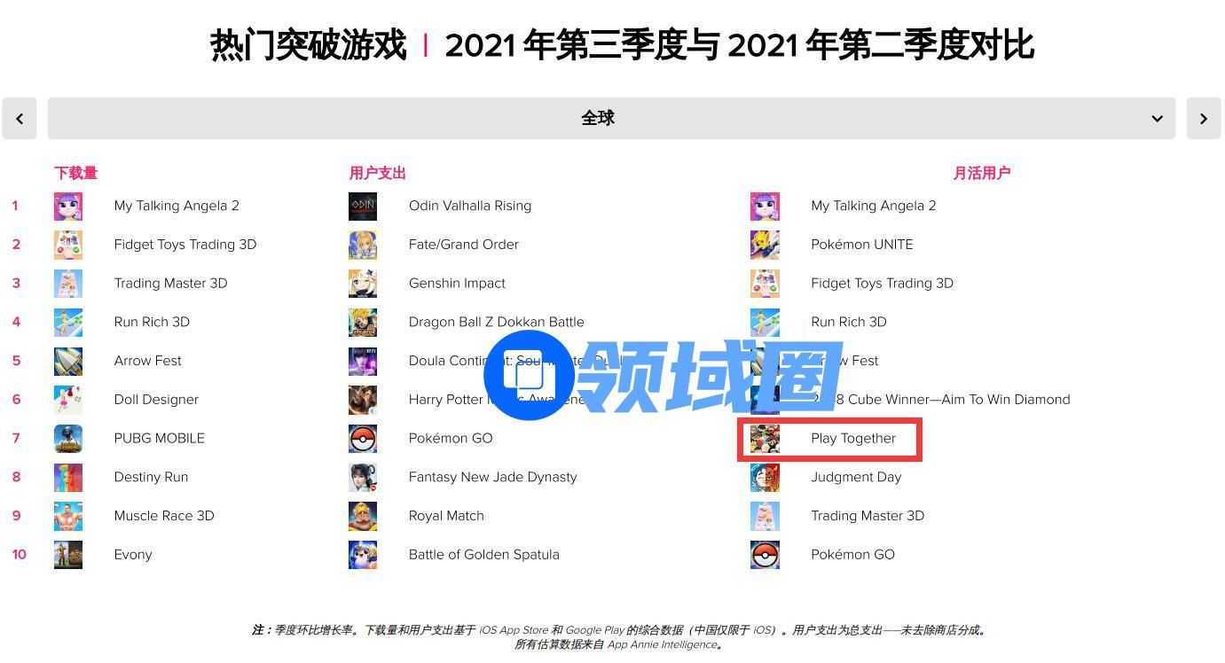 近期,App Annie发布了《2021年第三季度热门应用和游戏市场指数排名》,在反映季度环比增长率的“热门突破游戏”榜单中,月活环比增长最快的十款游戏里出现了一个新鲜的名字——《Play Together》。