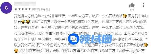 也正因为对简体中文的原生支持,在Google Play的上百万条评论中,也有不少来自国内玩家的评价。对于游戏的可玩性,玩家们还是给予了充分肯定。值得一提的是,有玩家在留言评论时也留下了自己的游戏ID,并表示非常愿意指导新手玩家快速上手游戏,这种没有任何功利目的的“老带新”也展现出了社交休闲游戏所特有的友善氛围。