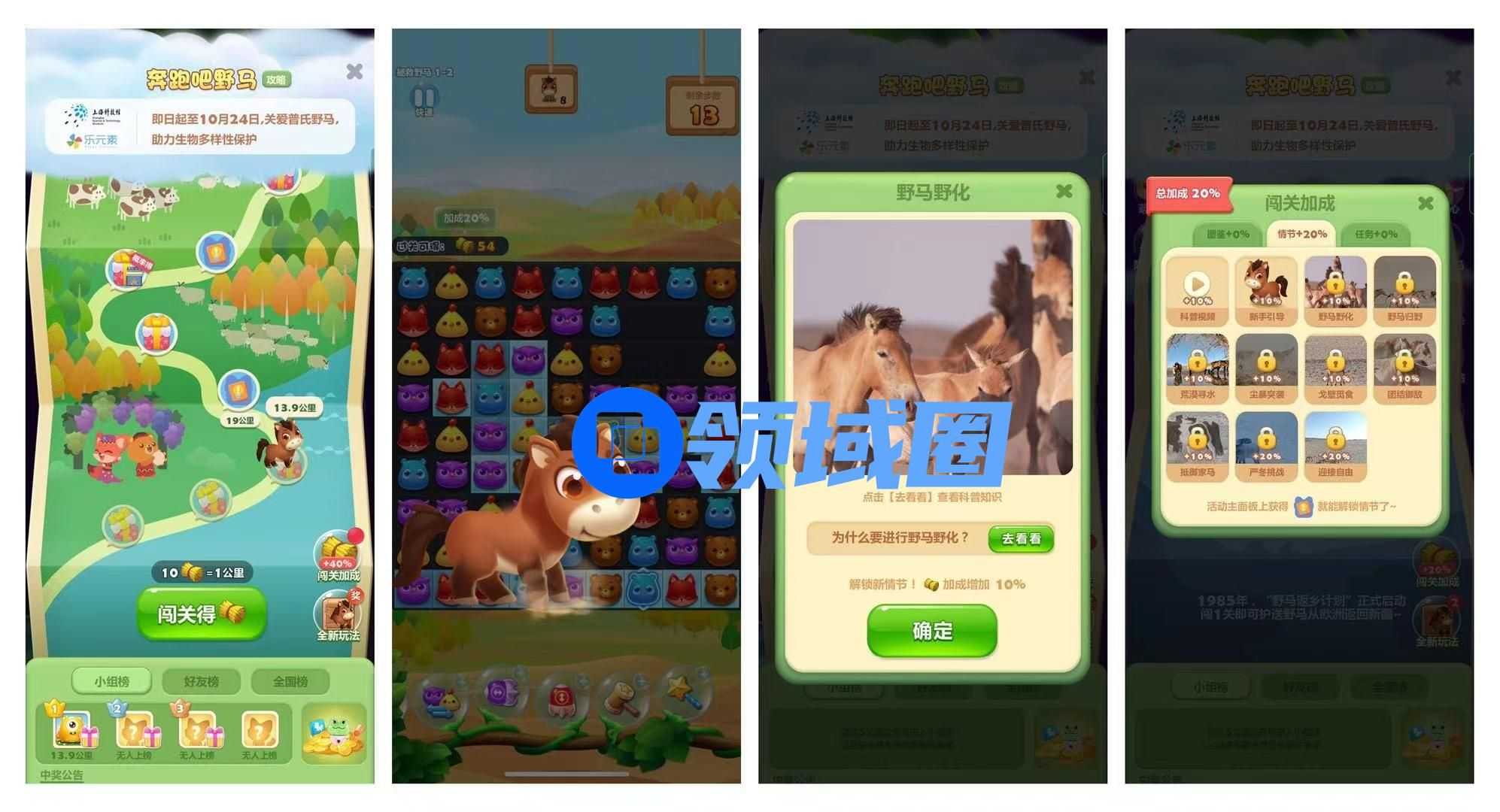 有别于一般科普宣讲的单向知识输出,乐元素与上海科技馆游戏创意团队通过低门槛、循序渐进的游戏设计,强化公众对于野生动物保护议题的理解。在为期7天(10月18日-24日)的游戏活动中,解锁9大故事情节,玩家化身 “守护者联盟”,闯关收集草料,助力野马前行回归到栖息地。