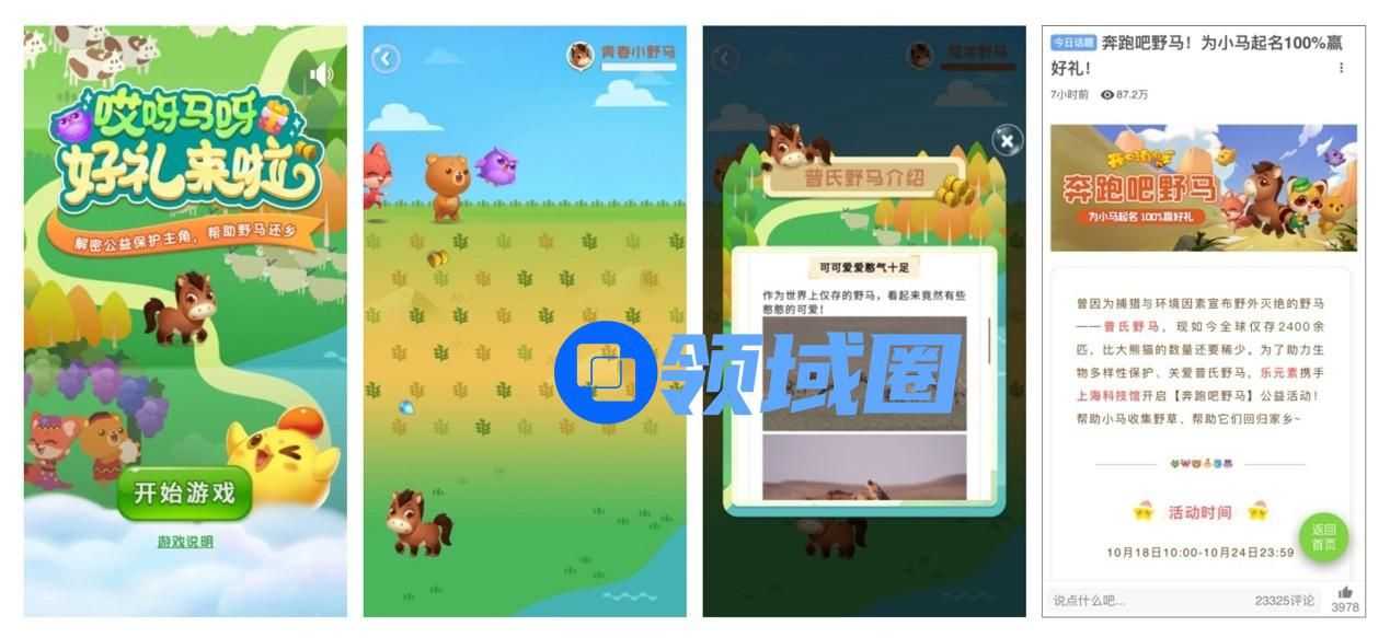活动如此火爆,得益于此次预热的“小心机”——消消乐先是为玩家们放了一波“回忆杀”,盘点了过去乐元素历年的公益对象,引起大家的好奇竞猜今年的公益主角;在与上海科技馆的联合策划下,消消乐还在玩家社区中提前模拟了一次“拯救”现场,在设计好的H5小游戏中,只要帮助野马收集掉落的草料和水,就能助力小马的形态长大,解锁野马科普知识。在悬念和创意都入味后,再发出一个令人更加激动的消息——游戏将以全体玩家的名义,终生认养一匹来自新疆野马繁殖研究中心的新生雄性野马,号召大家为小马起一个可爱的名字。
