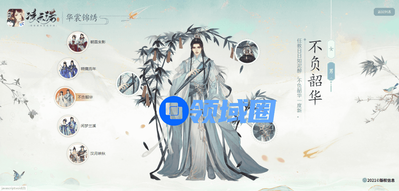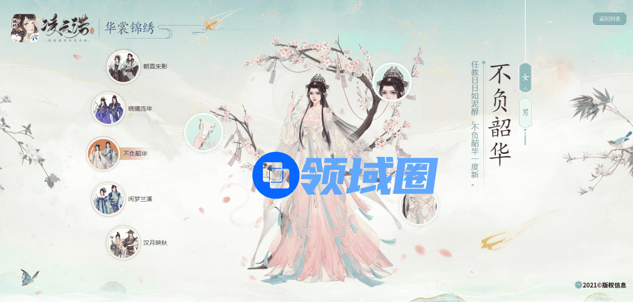 游戏中“不负韶华”这套以蝴蝶的为主题的时装,完全戳中了我的少女心!女性角色身着淡粉色长袍,衣身遍布层叠错落的桃花与桃枝,蝴蝶元素错落堆砌在裙摆,少女心爆棚实实在在戳到了我的审美点上;男性角色则身披青色长袍,纯银发冠以竹为形明君志,立于苍梧竹青之间,一副温润儒雅的做派,携青油纸伞行于烟雨之中,一身才气不负韶华。