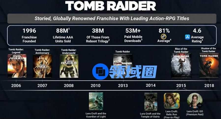 Embracer Group分享了《古墓丽影》系列的时间线,自1996年第一款游戏发行以来,《古墓丽影》已经卖出了8800万份。其中很大一部分——大约3800万的销量——要归功于“重启三部曲”,即从《古墓丽影》(2013)开始,然后是《古墓丽影:崛起》和《古墓丽影:暗影》。