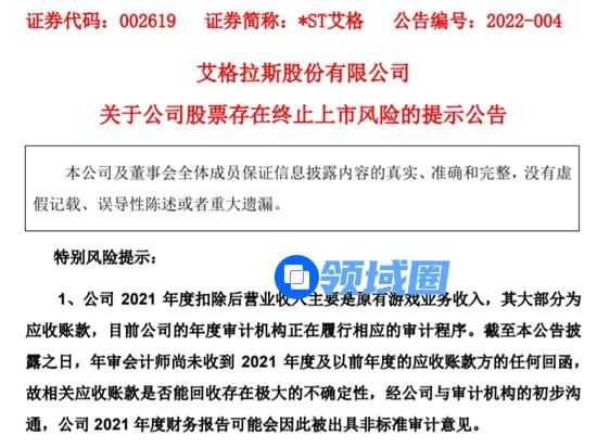 不止艾格拉斯,游久游戏也因年报预告亏损且年收入低于1亿元而触发了退市条款。