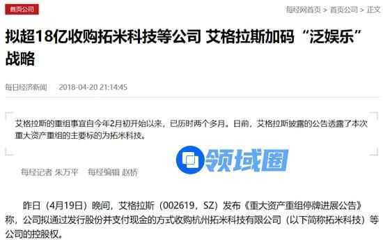 也是在2017年,艾格拉斯连续两年压线完成利润对赌后,决定再玩把大的:以发行股份的方式收购了游戏渠道拇指玩(3.38亿)与视频推广公司杭州搜影(13.55亿)。同时,艾格拉斯还有意收购以18~25亿元收购游戏厂商拓米科技,不过最终交易泡汤。