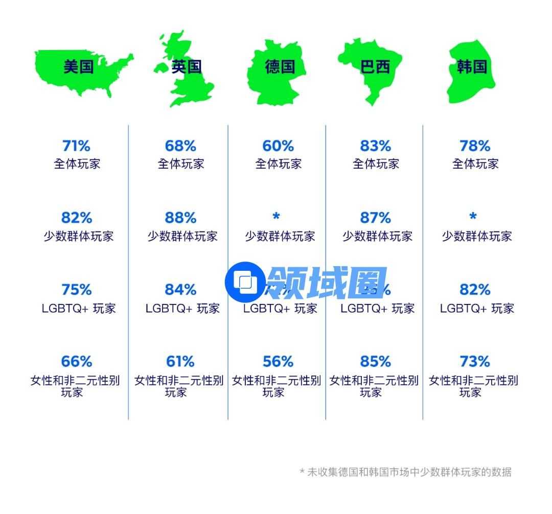会因为游戏中有更多“能够代表您或像您一样的人”的角色而觉得更有共鸣、更能沉浸其中或更喜欢玩游戏的受访玩家比例: