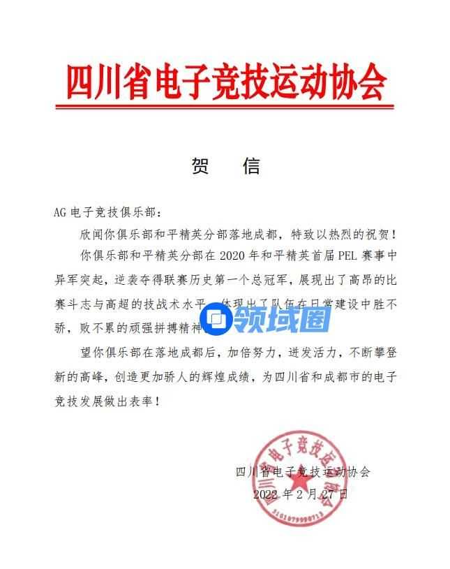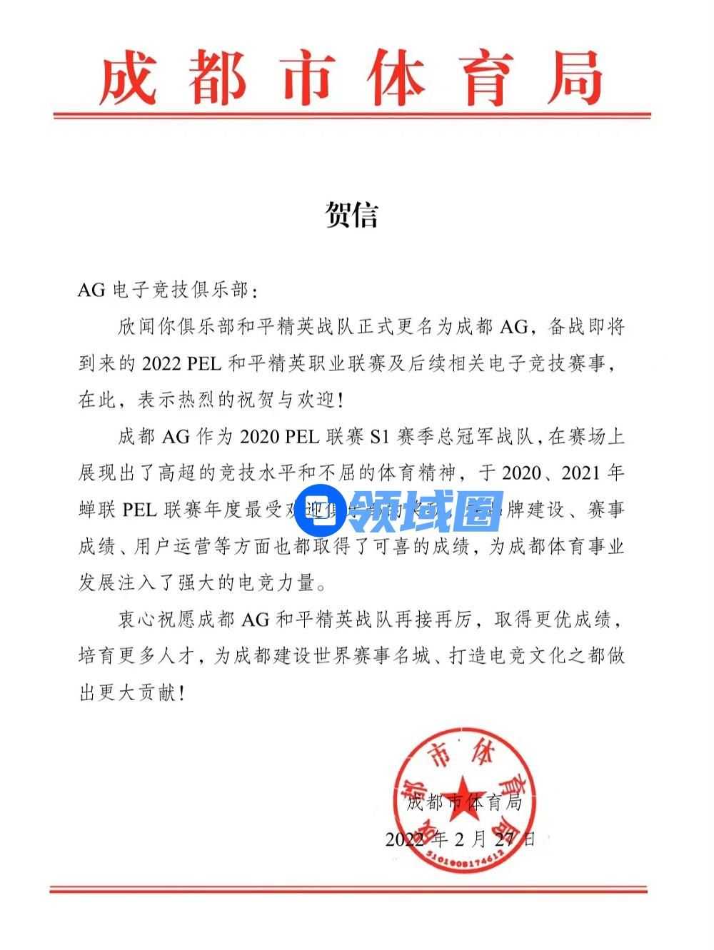 成都市体育局、四川省电子竞技运动协会等部门组织闻讯后纷纷发来贺信,祝贺AG和平精英战队落地成都,表达了对成都AG和平精英战队未来发展和共同打造成都成为赛事名城的美好祝愿。成都AG和平精英战队也将以此为激励,学习借鉴之前的地域化有益成果,不断进行新尝试,力争成为成都的城市新名片,实现战队和城市的双赢。