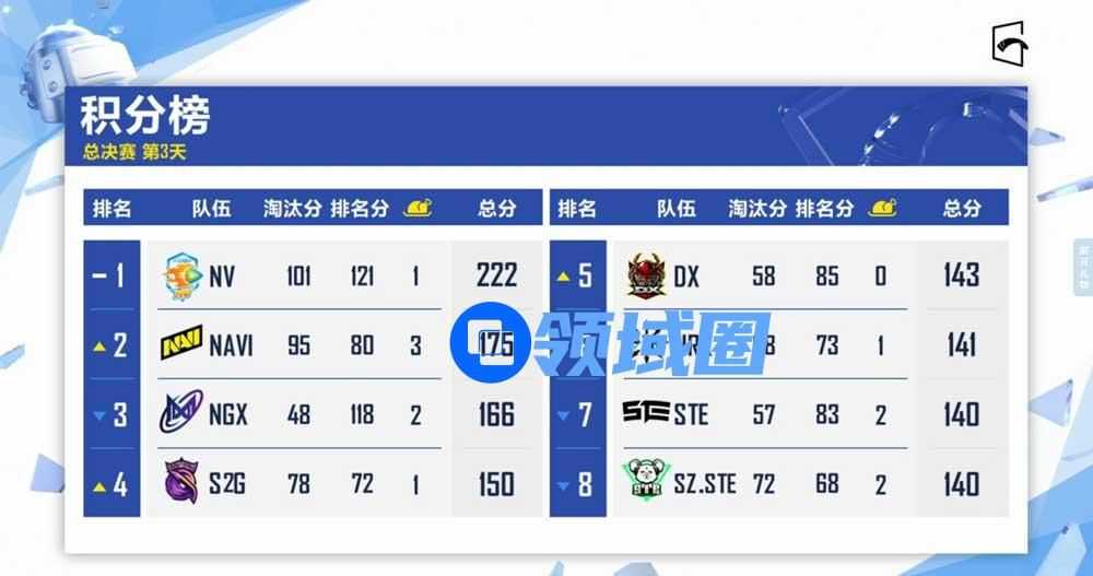 而代表PEL出征的另一支战队,STE从总决赛首日开始,稳定发挥,在前两日把自己的分数锁定在前八。在最后一天的比赛中发起最后冲刺,凭借稳定发挥,单日拿下50分的好成绩,总积分累积到140分,把排名保持在前八名。