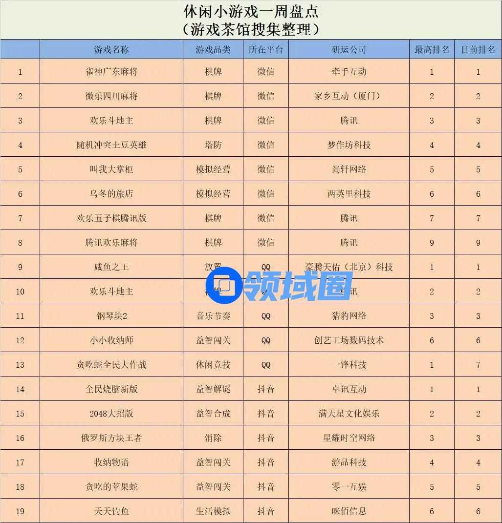在QQ小游戏中,豪腾天佑出品的放置类游戏《咸鱼之王》再次登顶魁首,腾讯的经典棋牌小游戏《欢乐斗地主》和猎豹网络的音游《钢琴块2》紧随其后,分别囊括了榜单第2和第3名。同时,创艺工场数码技术发行的益智闯关类游戏《小小收纳师》本周首次跻身进入QQ小游戏热玩榜单前列,且其当前位于榜单第6名。