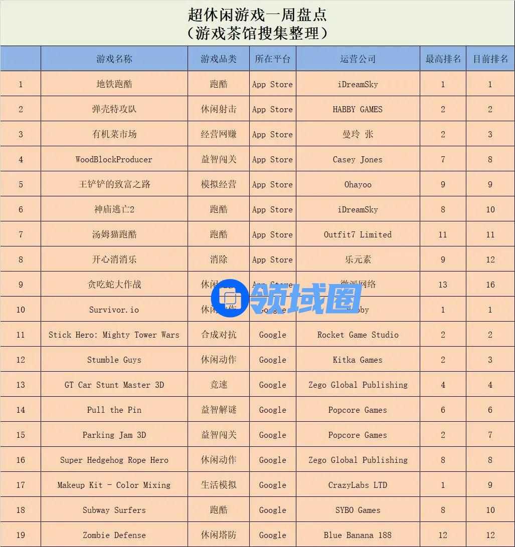 超休闲游戏方面,海彼游戏国内外成绩突出,在App Store免费游戏榜单中,射击玩法的《弹壳特攻队》跻身榜单TOP2;Google Play免费游戏榜单中,同样来自海彼游戏的《Survivor.io》登顶榜首。