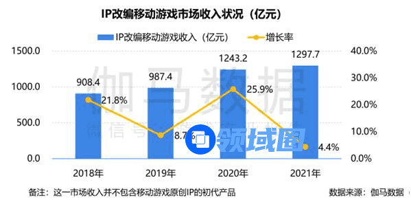 根据伽马数据,从2016年起,中国手游移动市场就刮起“IP游戏热”,IP游戏占比高达6成,而到了2021年,尽管IP改编移动游戏市场收入增长已减缓,但也已达到1287.7亿元,收入占比仍有5成以上。