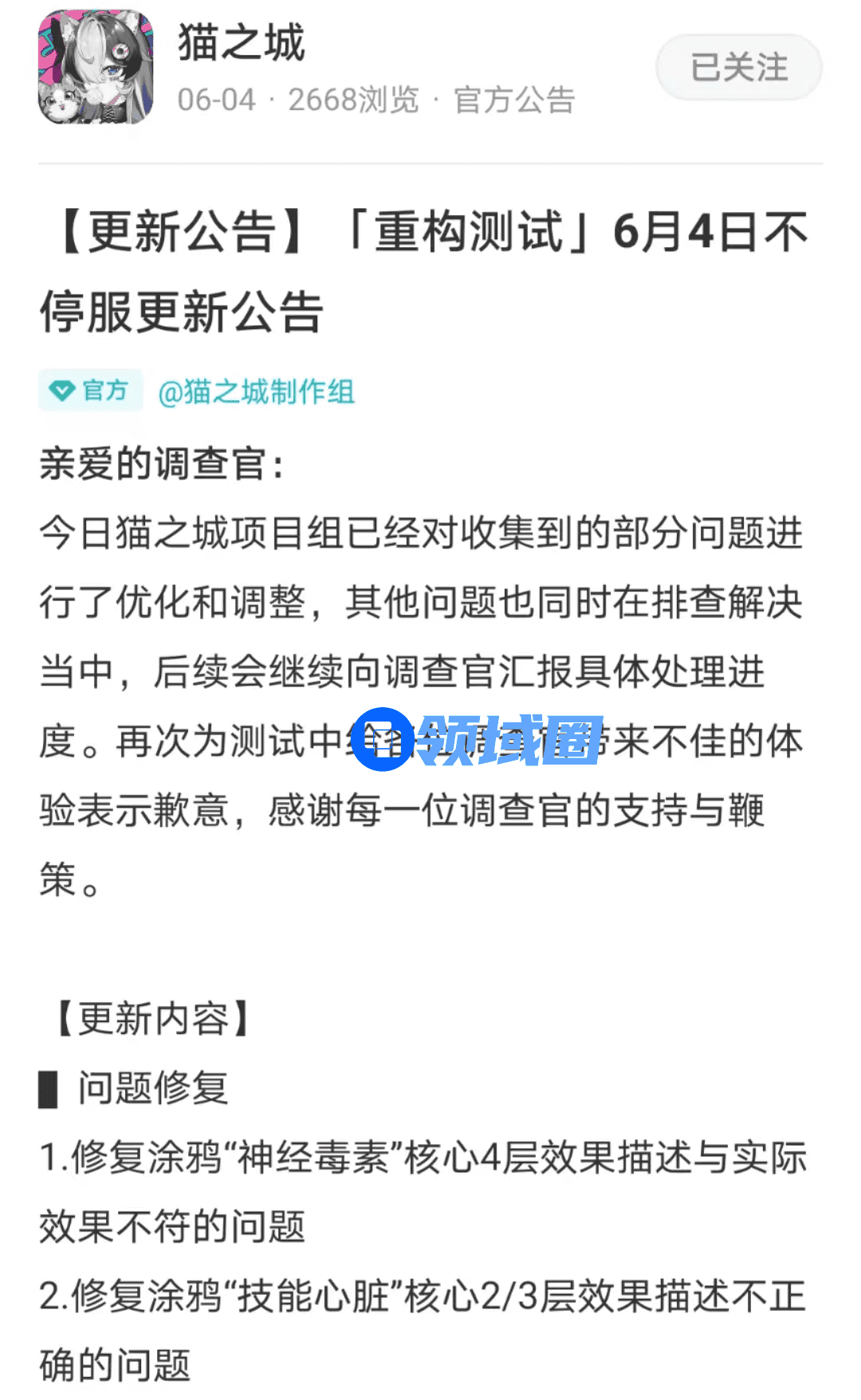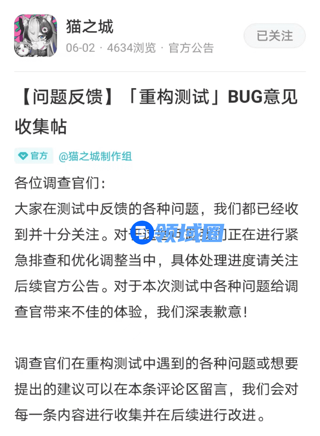 目前距离公测不足半月,7月6日,猫之城官方也根据重构测试的优化方向,出了视频内容详细讲解。