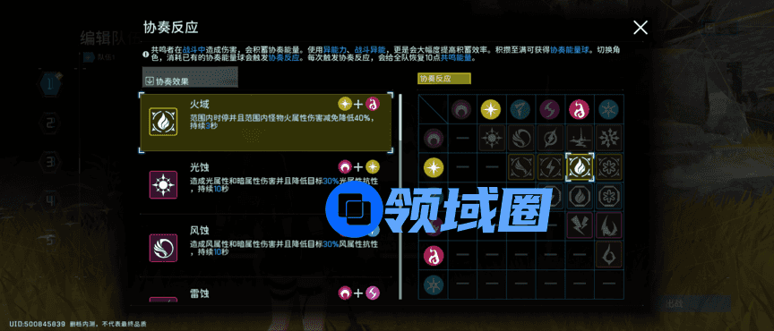 另一个核心设定。游戏中共有6大属性,当角色之间进行切换时则会触发协奏反应,根据角色属性效果各不相同。比如从雷属性与暗属性角色切换时候会触发【风蚀】,造成大量伤害的同时且降低怪物抗性,协奏反应是战斗中伤害的主要来源之一。