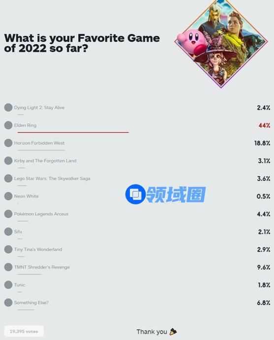 IGN开启了2022年度最佳游戏的投票活动,《艾尔登法环》不出意外地以绝对的优势夺得榜首,其得票占比高达44%,功夫动作游戏《师父》出人意料地挤进了榜单前10的位置。当然,2022年目前也只是刚刚过半,下半年仍有不少佳作值得期待。