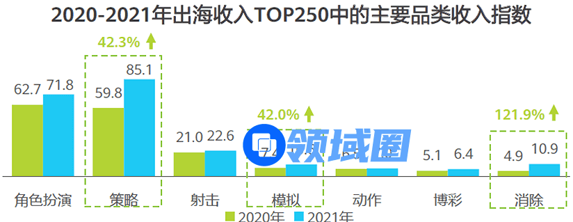 从游戏产品类型来看,大部分品类收入均有增长,而消除、策略和模拟品类更是成为出海收入增长最快的品类,同比增长均超过了40%。尤其是消除品类,更是一口气增长了121.9%。