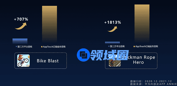 相关数据显示,加入AppTouch VIP Service后的《Stickman Rope Hero》,在2020年12月至2021年11月近一年时间里,营收增长了1813%;同期,另一款游戏《Bike Blast》收入增长了707%,增收效果显著。