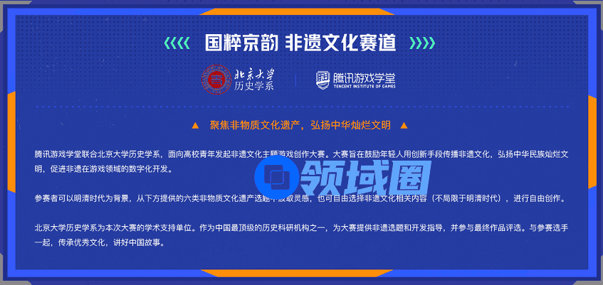 目前,在腾讯游戏学堂和北京大学历史学系的共同支持下,本年度腾讯高校游戏创意制作大赛“非遗文化赛道”已经启动报名,期待着对游戏怀有无限热情和创想的同学们通过比赛对中国非遗文化有更深刻的认知,通过游戏制作的方式传播中国之美、民族之美。