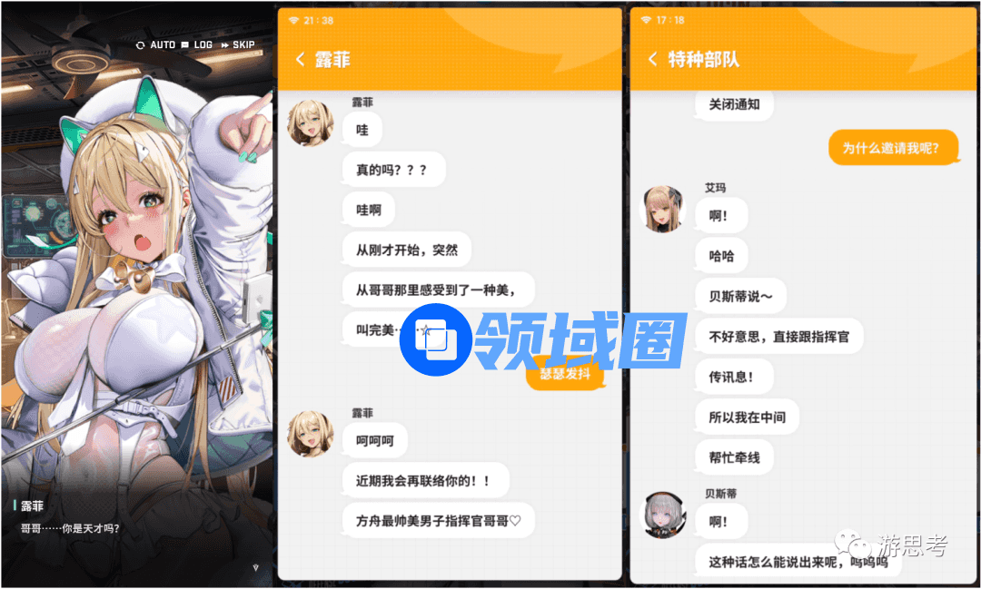 - 角色剧情则表现形式更加丰富。好感度剧情、咨询、基地任务、聊天(私聊、群)方方面面呈现了我们和角色的相处细节,十分有生活感。值得一提的是聊天软件,非常口语化、错字、取外号等让我们似乎是和真人在聊天一样,而聊天也很直球的展示角色性格。比如我就在露菲的夸夸里沉沦了——我也不想的,可是她叫我哥哥诶