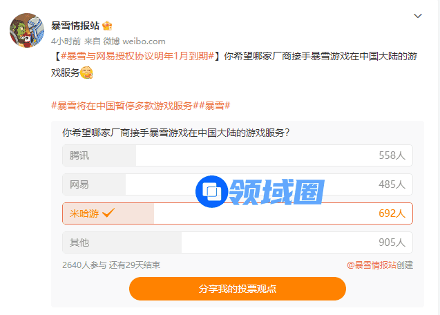 专注发布暴雪游戏信息的自媒体暴雪情报站发起了关于“你希望哪家厂商接手暴雪游戏在中国大陆服务的投票”,但选项一共只有四个,目前米哈游以略微的优势领先腾讯。