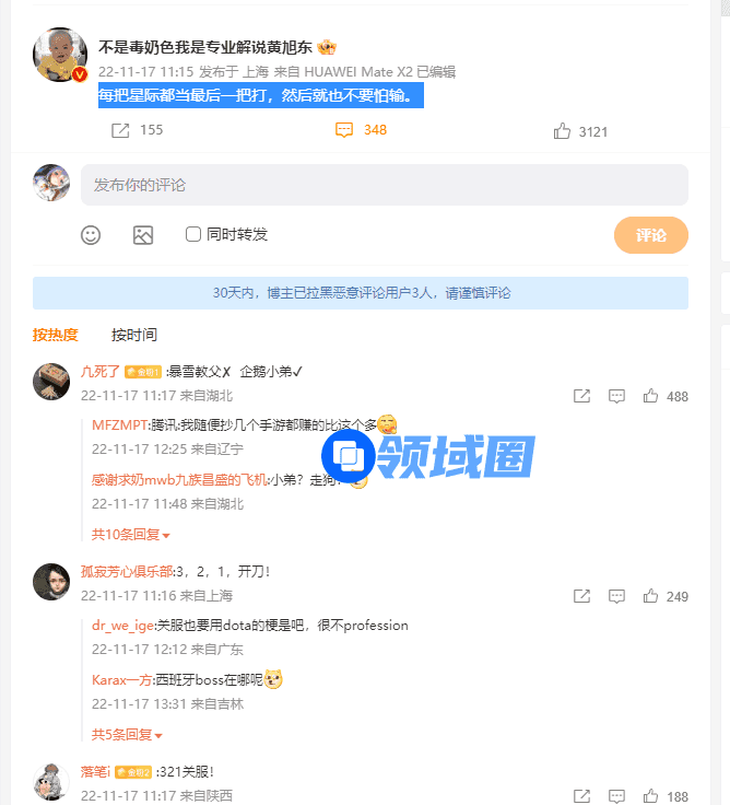 知名电竞(毒奶)解说黄旭东发布了微博,文案是“每把星际都当最后一把打,然后就也不要怕输。 ”,玩了《Dota2》LGD战队教练小8在Ti11总决赛上的名台词梗,而下面的评论区也很懂的回复着“321,关服!”