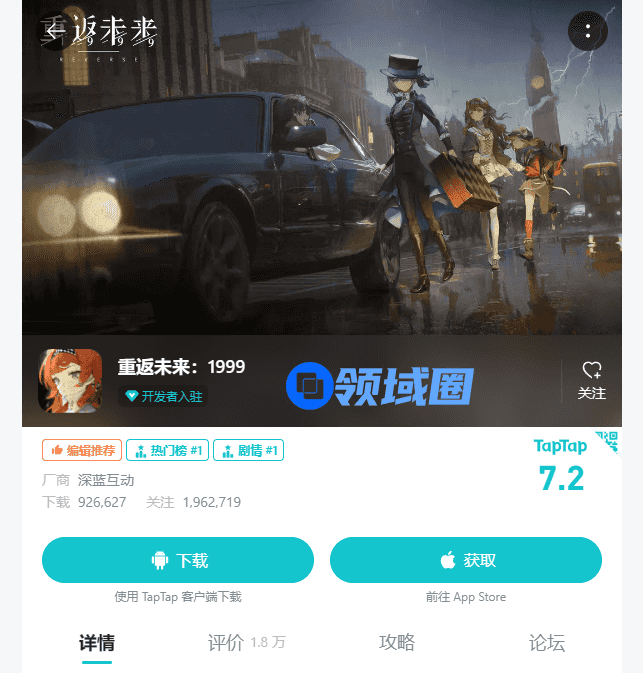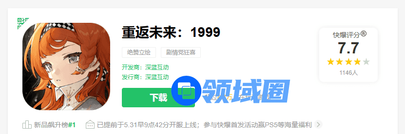 5月31日,万众期待的《重返未来:1999》正式开启公测,这是一款以神秘学和电影式叙事体验为主要卖点的二次元回合制RPG,目前TapTap平台下载量超过91万、1.8万人评分7.2;好游快爆7.7分。