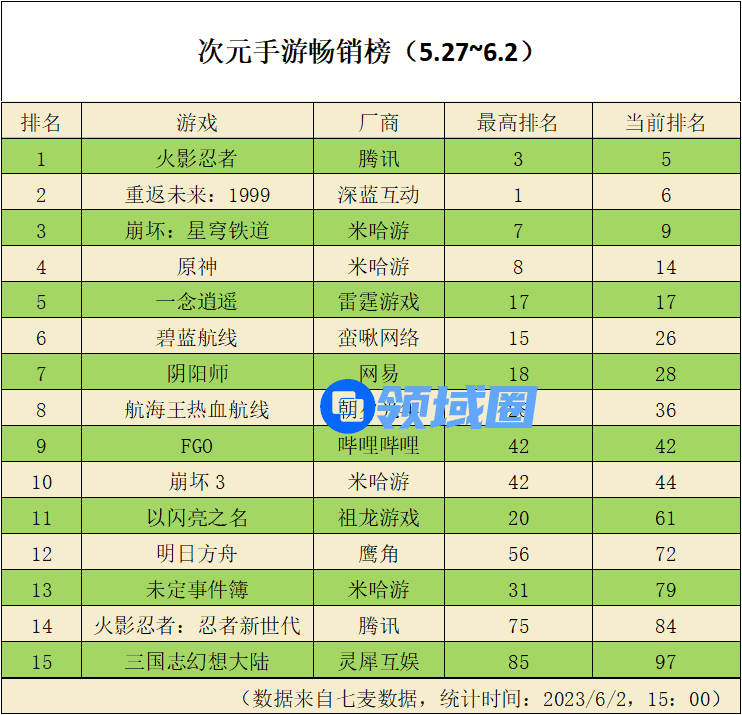 《重返未来:1999》令人惊讶地不在本次榜单第一名,腾讯《火影忍者》在七麦数据IOS端收入预估在5月31号仅27万美元,而6月1号一跃跳至161万美元,以1万刀的微弱优势拔得头筹;而米哈游作品少见地四作同时进入畅销榜Top100并且《崩坏:星穹铁道》流水依然稳定;蛮啾网络的《碧蓝航线》也因周年庆强势上榜,位居二游第六。