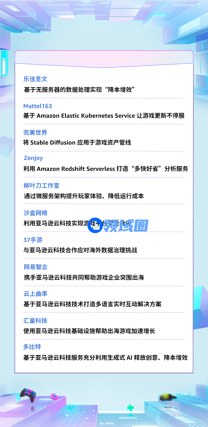 此外,针对游戏开发精品化的行业大趋势,亚马逊云科技还将对旗下Serverless、NoSQL、后端服务、微服务等产品及相关解决方案进行详尽介绍与分享,帮助开发者们从云端游戏开发、游戏服务器架构、监控游戏状态等底层的琐碎工作中解放出来,加速优质创意落地,推动开发者将更多精力回归到游戏本身的内容建设上。
