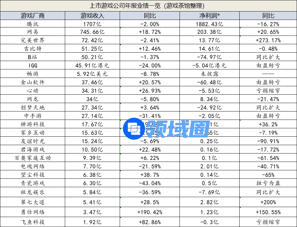 游戏茶馆总结了多家游戏上市公司年报数据,按游戏业务收入进行了排序,供读者参考。