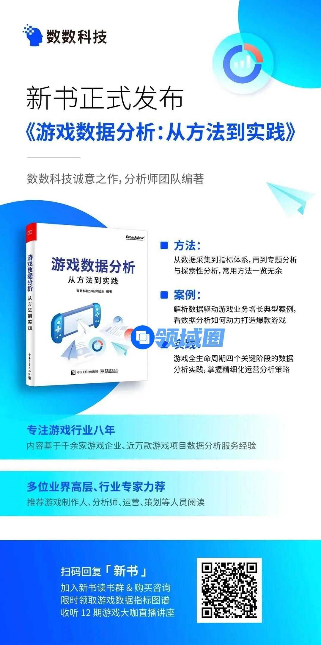 如今,许多游戏企业都成立了自己的数据分析团队,大家对游戏数据分析的重要性也已达成共识。但游戏产品类别繁多,不同类型游戏的用户特征差别较大,数据分析的难度和复杂性存在显著差异。为帮助游戏行业从业者打开关于数据分析的新思路,数数科技分析师团队从游戏业务场景出发,筹备近两年时间,将千余家游戏企业、近万款游戏项目数据分析服务经验编著成书——《游戏数据分析:从方法到实践》,正式出版发售。