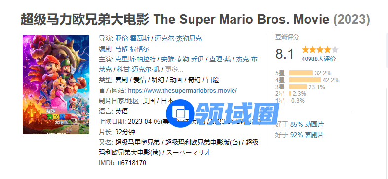 电影不仅在票房上取得了极好的成绩,口碑也十分出彩,目前为止,《超级马力欧兄弟大电影》在豆瓣评分人数超过4万的同时评分稳定在8.1分、猫眼评分9.4,而海外烂番茄爆米花指数也有96%。
