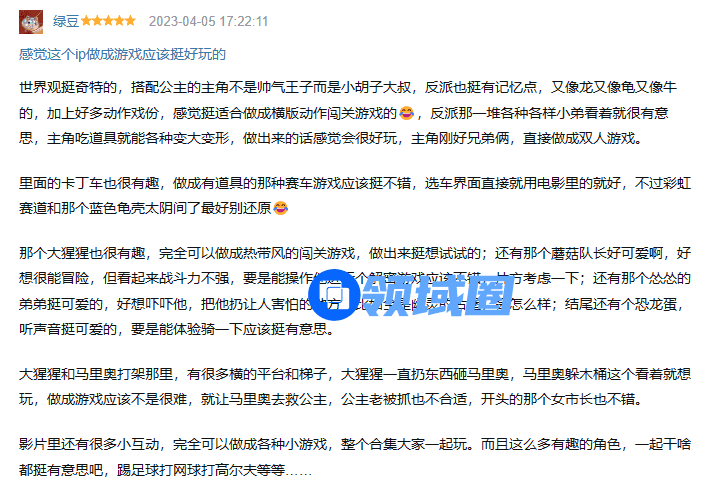 不同于大多数口碑好的电影,马力欧大电影的剧情继承了原作游戏一直以来的特点——简单而有趣,它很好地平衡了只听说过“超级玛丽”名号的路人和系列老粉的观影体验,一方面,它的世界观有趣,情节简单易懂,这就大大降低了路人的观影门槛,使得不管是年龄较小的孩子还是陪孩子去电影院的家长都能愉快地观影一个多小时;而另一方面,电影中包含的游戏彩蛋,又完美地满足了绝大多数老粉的情感需求——接受采访的宝琳、一般路过的耀西、游戏经典BGM的乱入和来自大金刚时期的远古彩蛋......甚至有人评论这部电影为“由彩蛋组成的电影”。