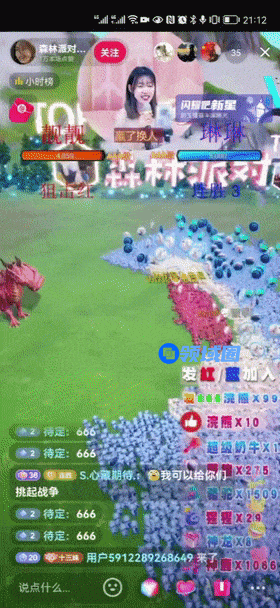 但从最终呈现出的效果来看,小玩法和我们在前面提到的其他平台的互动游戏模式基本一致。以极具代表性的《森林派对》为例,用户只需要在弹幕中输入“红”或“蓝”指令,即可加入相应队伍,点赞或刷礼物就可以召唤出浣熊、奶牛、野猪等大怪,增强我方攻击力,冲击敌方大龙,哪一方先将对方的大龙血条清零,即可获得胜利,赢得对应的积分奖励。