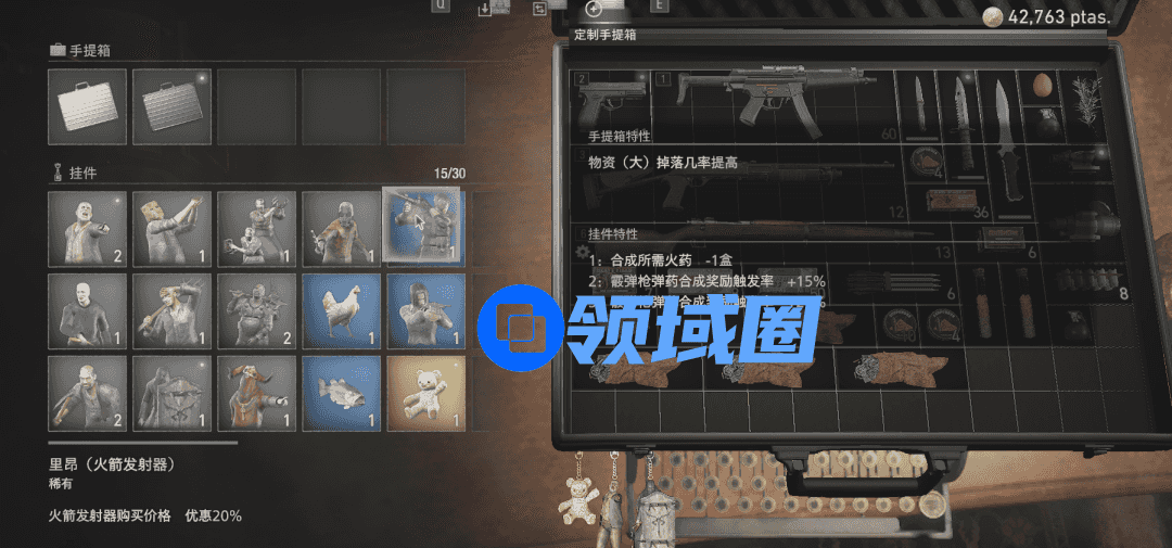 还有一个非常时髦的要素,玩家可以自定义陪伴里昂的背包手提箱,分为三个挂件和箱子壳,为玩家提供合成道具时的加成,这些挂件来自挑战靶场后的扭蛋机,每周目玩家都可以来抽上十几次卡——也是会抽出重复的。抽卡+Perk的玩法具有重复可玩性,笔者目前在二周目就打算尝试使用一把全自动连发的败家手枪,而背包技能使用“手枪弹药获取率+手枪弹药合成率+合成火药粉消耗减少”的三件套,最大程度保障续航。