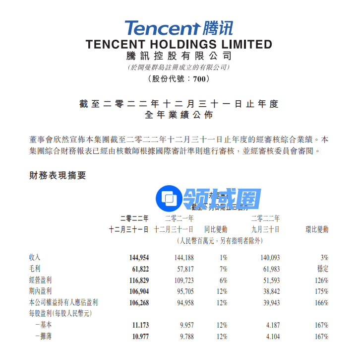 近日,腾讯发布了2022年财报信息。2022年腾讯总收入为5546亿元人民币,同比下降1%,净利润为1882亿元人民币,同比下降16%。其中,Q4季度总收入为1450亿元,同比增长1%,净利润为1063亿元,同比增长12%。