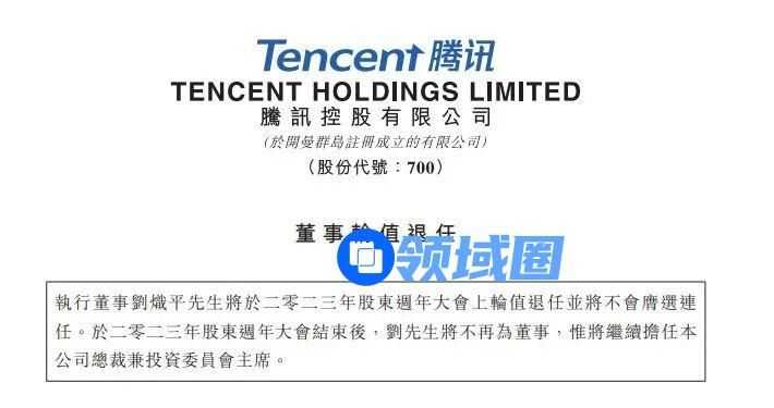此外,腾讯还宣布执行董事刘炽平先生将轮值退任不会膺选连任,在2023年股东周年大会结束后,不再为腾讯董事,惟将继续担任公司总裁兼投资委员会主席。