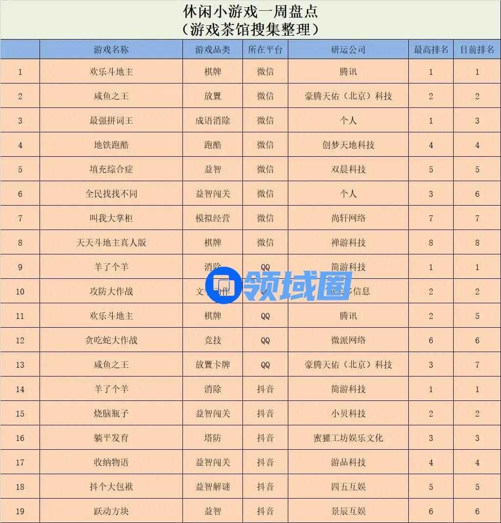 休闲新游周报每周统计微信小游戏、QQ小游戏、抖音小游戏、硬核小游戏以及App Store和Google Play上的新游爆款,并按照分类制作表格,将游戏排名情况等信息公布,希望给到行业同侪帮助。
