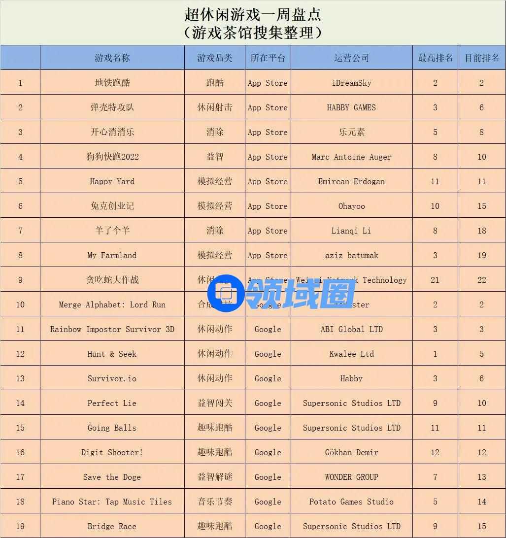 超休闲游戏方面,在App Store免费游戏榜单中,益智游戏《狗狗快跑2022》空降TOP10;Google Play免费游戏榜单中,合成对抗游戏《Merge Alphabet: Lord Run》空降魁首,“躲猫猫”式动作游戏和趣味跑酷玩法正热。