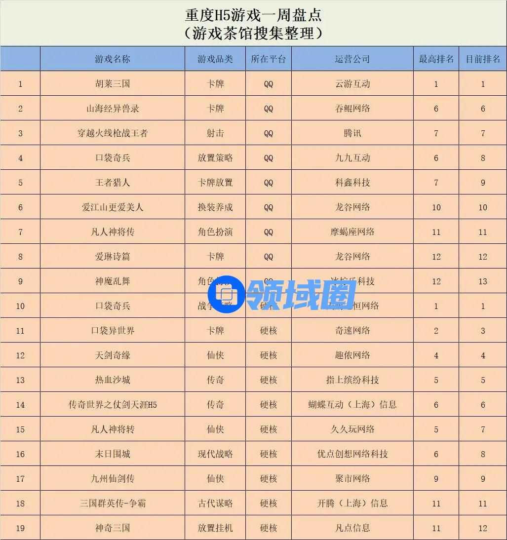 重度H5游戏:《王者猎人》冲上TOP10,《三国群英传-争霸》排名上升