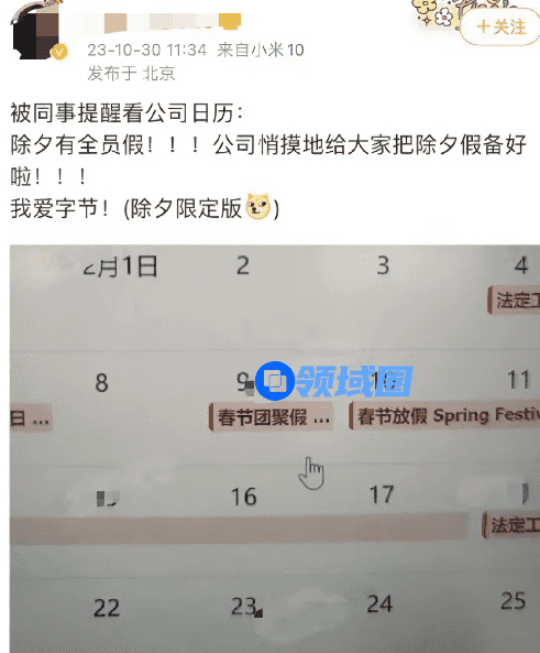 10月30日,网传字节跳动2024年春节除夕统一放假,在员工的飞书日历中,已经能够看到除夕当天被标记上了“春节团聚假”。