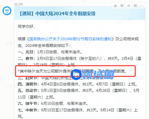 该消息目前已被字节员工证实,据员工透露,字节于10月30日发布2024年全年假期安排公告,其中春节放假时间为2月9日至17日(除夕至初八),并注明除夕当天为公司额外提供的春节团聚假,不占用年假额度