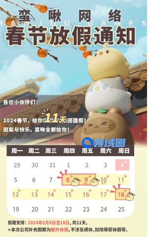蛮啾网络的春节假期更是从2月8日至18日,连放11天,而且其中的补充假期也是额外休假,不涉及调休和扣除带薪休假。