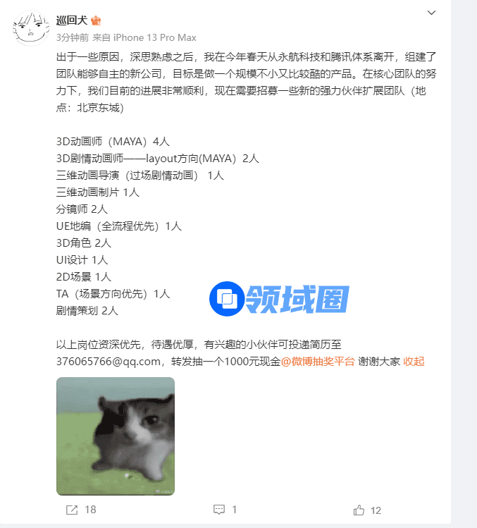今日,腾讯旗下二次元游戏《白夜极光》的艺术总监【巡回犬】在社交平台公开宣布,因为一些原因其个人已经于今年春天从永航科技以及腾讯体系离开并成立新公司,工作地点位于北京东城。
